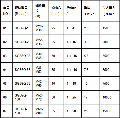 采用*行星變速結(jié)構(gòu)作為主傳動(dòng),體積小,重量輕,由于變速比大,輸入較小力量就能產(chǎn)生很大的輸出扭矩,反作用支腳可360°任意調(diào)換位置,操作人員只需要施加很小的力,既可得到5-40倍的輸出力距,配套扭力扳手根據(jù)傳動(dòng)比預(yù)置好扭力,達(dá)到相應(yīng)預(yù)緊扭矩,能自動(dòng)發(fā)出訊號““嗒””的一聲報(bào)警,同時(shí)伴有明顯的手感振動(dòng),從而輕捷的完成螺栓螺母的緊固拆卸工作